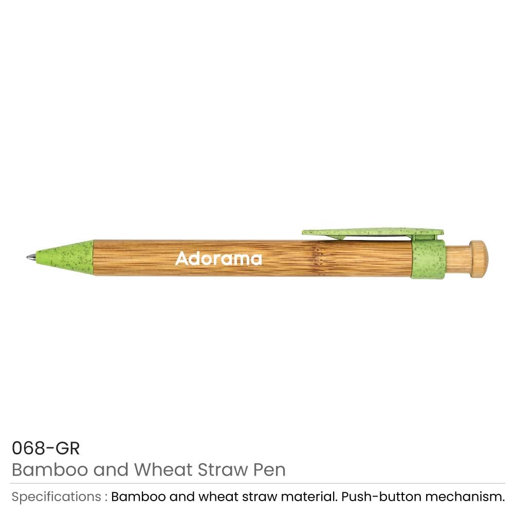 أقلام بامبو ترويجية صديقة للبيئة بتصميم مبتكر يجمع بين البامبو الطبيعي وألياف قش القمح. يأتي جسم القلم (الباريل) مصنوعاً من بامبو أصلي ليكون خياراً مستداماً يساعد على تقليل استخدام البلاستيك، بينما تم تصنيع المشبك والطرف وزر التشغيل من قش القمح بألوان مميزة تضيف لمسة عصرية. ويمكن تثبيت القلم بسهولة على القميص أو الحقيبة عبر المشبك، مما يجعله عملياً للاستخدام اليومي.