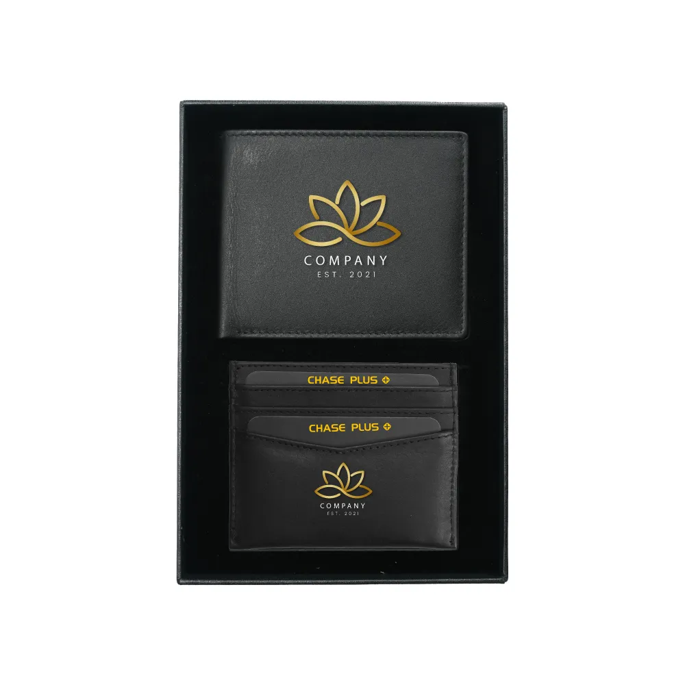 مجموعة هدايا أعمال تشيس بلاس الأنيقة والأنيقة تجمع بين الوظيفة والفخامة مع إكسسوارين جلديين فاخريين: محفظة رجالية وحامل بطاقات ائتمان، كلاهما مزود بحماية RFID للحفاظ على معلوماتك الشخصية آمنة.