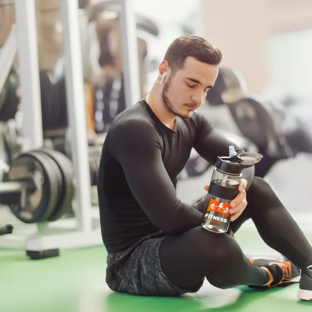 زجاجة رياضية صديقة للبيئة مصنوعة من rPET (PET مُعاد التدوير) بسعة 700 مل، بتصميم أسود شفاف أنيق مع قبضة سيليكون تمنح ثباتاً وراحة أثناء الحمل. يأتي الغطاء بزر ضغط لتسهيل الفتح والإغلاق بسرعة، بينما توفر الشفّاطة شرباً سلساً ومناسباً أثناء التمرين أو التنقل.