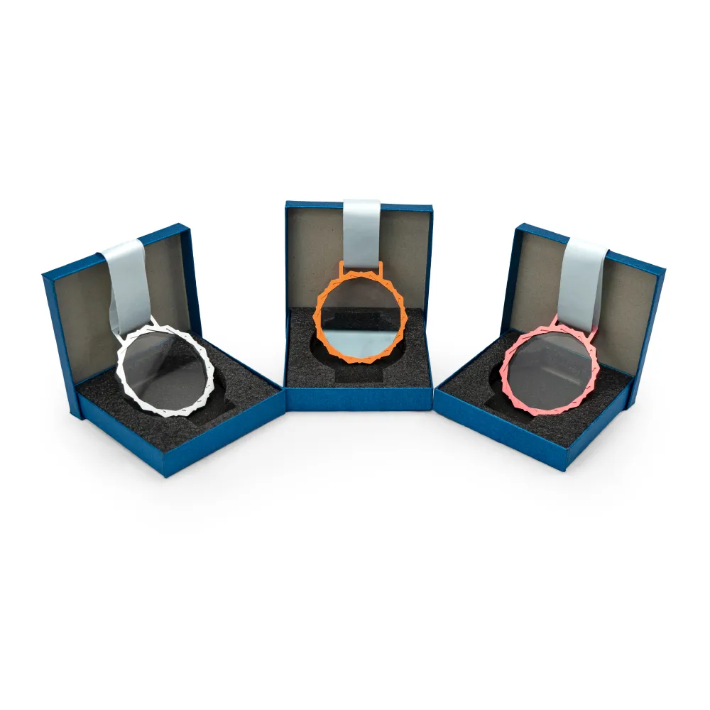 احتفل بالتميّز مع ميداليات كريستال زجاجي شفافة دائرية فاخرة مصممة لتترك أثراً دائماً. تتميز كل ميدالية بمركز زجاجي شفاف عالي النقاء، مُثبت بإحكام داخل إطار معدني أنيق عالي الجودة، مع خيارات تشطيب: Indochine Gold (ذهبي)، Silver (فضي)، أو Coral Red (أحمر مرجاني).