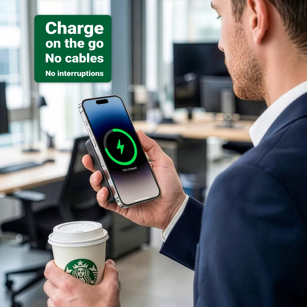 إذا كان هدفك هدية تقنية “تستخدم فعلاً” وتظهر العلامة التجارية بشكل راقٍ، فهذا الباوربانك اللاسلكي المتوافق مع MagSafe خيار ممتاز. يتميز بتثبيت مغناطيسي ذكي يضمن تماسك الجهاز أثناء الشحن، مع قدرة شحن لاسلكي سريع 15W تمنح المستخدم تجربة عملية وسلسة في السفر، العمل، أو الاستخدام اليومي.
