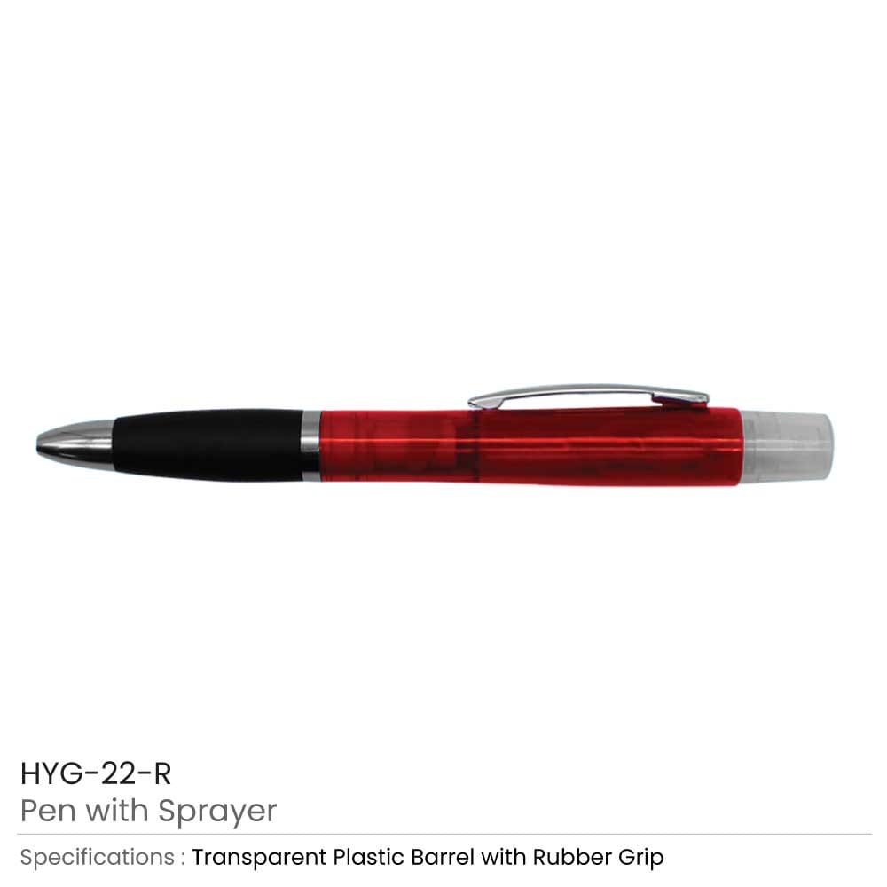 قلم دعائي عالي الجودة يجمع بين الكتابة والنظافة في منتج واحد، مزوّد ببخاخ معقم عملي للاستخدام اليومي. مصنوع من بلاستيك متين 100% مع جسم شفاف وملون يمنح مظهراً عصرياً واضحاً. يتميز بتصميم أنيق يضم قبضة مطاطية سوداء لراحة أكبر، ومشبك كروم، ورأس فضي، مع هيكل بلاستيكي شفاف.
